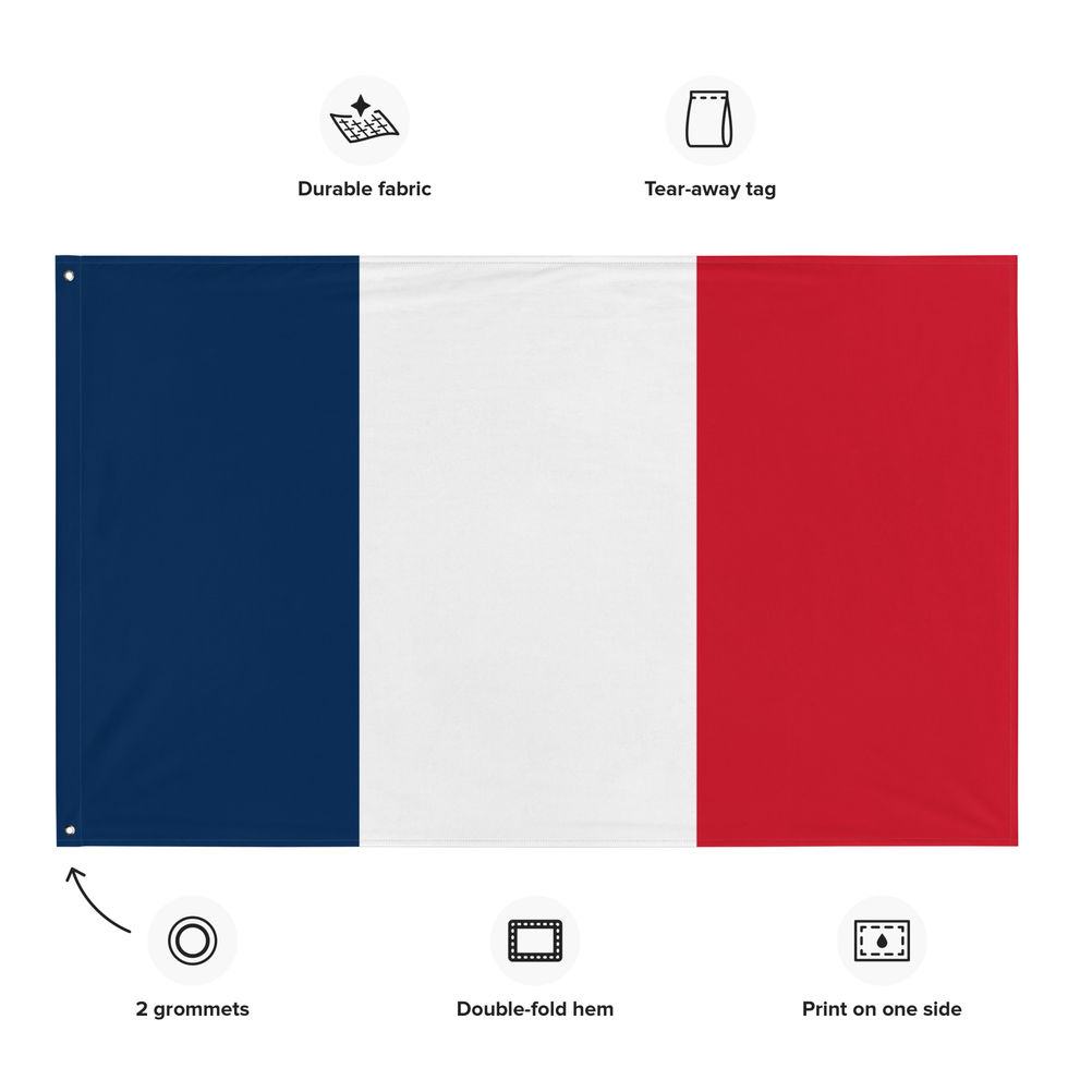 Constructed from durable, high-quality materials, our French Flag is not only built to last but also designed to radiate vibrant colors. It's a versatile decoration for homes, businesses, and gatherings, making it easy to express your affinity for the rich cultural tapestry of France.
